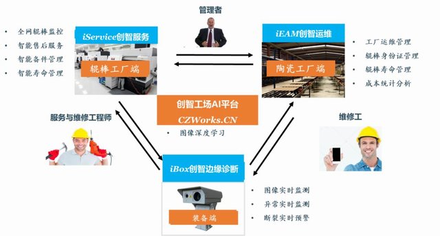 創(chuàng)智工場(chǎng)與輥棒生產(chǎn)企業(yè)了解到輥棒斷裂一直以來(lái)都是客戶管控難點(diǎn)和痛點(diǎn),決定共同應(yīng)用創(chuàng)智工場(chǎng)的智能服務(wù)平臺(tái)能力建設(shè)AI 輥棒斷棒監(jiān)測(cè)系統(tǒng)。陶瓷輥棒壽命管理系統(tǒng)應(yīng)用了創(chuàng)智工場(chǎng)的創(chuàng)智物聯(lián)、創(chuàng)智運(yùn)維產(chǎn)品以及AI平臺(tái)開(kāi)發(fā)技術(shù),整體架構(gòu)如下: 應(yīng)用創(chuàng)智盒子邊緣AI深度學(xué)習(xí)技術(shù),以高清攝像頭為物聯(lián)傳感器監(jiān)控裝備端,實(shí)時(shí)通過(guò)輥棒的旋轉(zhuǎn)運(yùn)動(dòng)軌跡提前預(yù)測(cè)輥棒異常與壽命。陶瓷生產(chǎn)工廠應(yīng)用創(chuàng)智運(yùn)維產(chǎn)品,建立了輥棒身份證檔案管理。維修工不用巡線,即可得到輥棒壽命預(yù)測(cè)、預(yù)警與報(bào)警,提前“換輥”,避免“堵窯”的非計(jì)劃停機(jī),并可成本控制。陶瓷生產(chǎn)工廠還可以使用創(chuàng)智運(yùn)維云平臺(tái)實(shí)現(xiàn)整個(gè)工廠的生產(chǎn)設(shè)施管理,包括點(diǎn)檢、維護(hù)、維修與配件管理。輥棒供應(yīng)商應(yīng)用創(chuàng)智服務(wù)產(chǎn)品,實(shí)現(xiàn)全網(wǎng)輥棒大數(shù)據(jù)監(jiān)控,提前實(shí)現(xiàn)備件備貨與服務(wù)工程師的統(tǒng)一管控,大大提前備件準(zhǔn)時(shí)率與服務(wù)工程師運(yùn)營(yíng)效率。